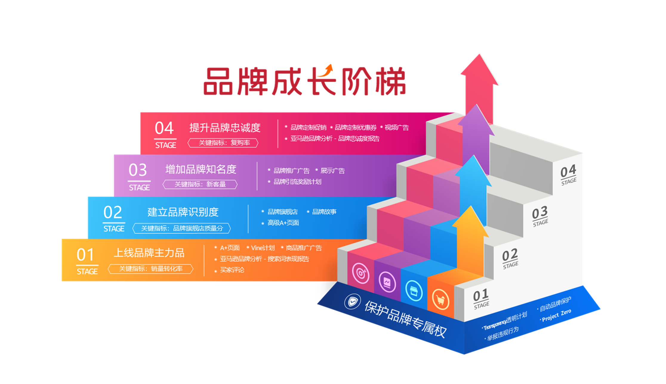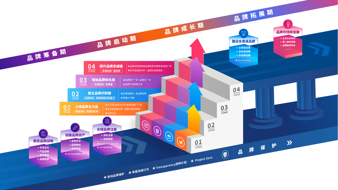 根据各阶段核心目标,支持卖家制定品牌战略,创建品牌资产,合规品牌注册,快速品牌启动,高质量品牌成长,全面品牌保护,建设全渠道品牌,和品牌可持续发展,助力品牌卖家在高速成长的跑道上,如虎添翼,勇攀高峰!