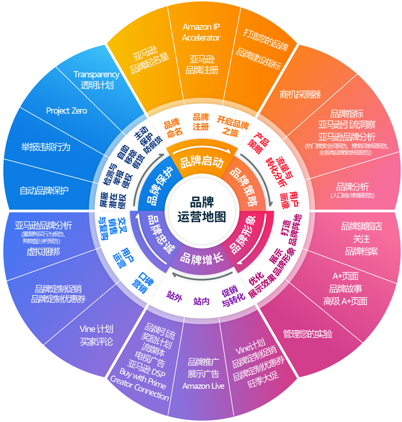 亚马逊将其30+个品牌打造工具,根据其功能属性,分为6大模块19个小类,通过品牌工具花瓣图,卖家能按图索骥,轻松锁定解决方案!