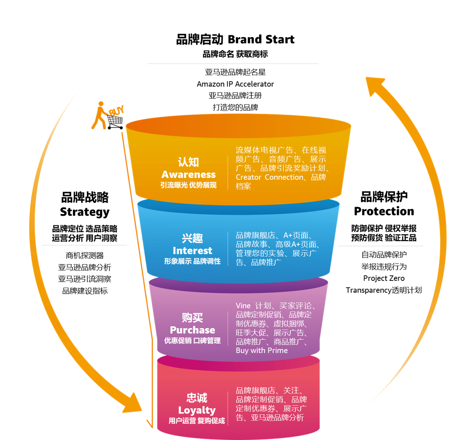 通过AIPL模型,梳理营销流量转化的消费者旅程中亚马逊提供的解决方案,而品牌战略和品牌保护将始终贯穿始终,为您洞察商机,保驾护航。
