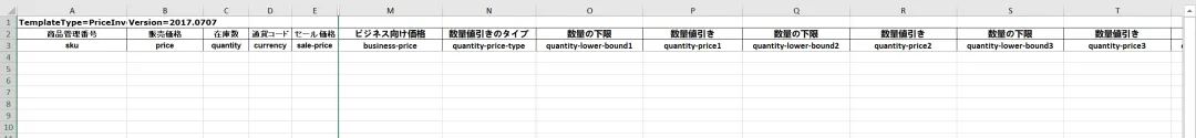 4)打开下载的商品价格和数量模板,把库存报告中的SKU信息复制到模板的对应列中,并添加想要设置的企业价格和批量折扣。