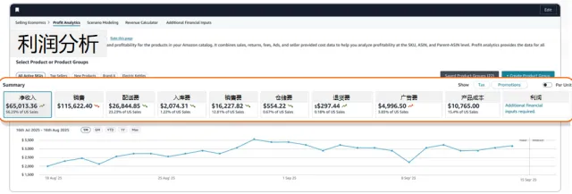 通过该工具,您可以分析亚马逊目录中商品的费用、成本和盈利能力。它整合了销售、退货、费用、广告和您提供的成本数据,以帮助您分析 SKU、ASIN 和父 ASIN 级别的盈利能力,可提供最多 50 万个在售商品的历史数据和未来预计数据。