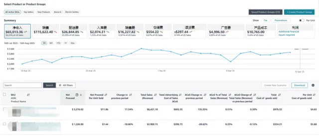 提供183个指标,让卖家能精准定位到是哪个ASIN的仓储费异常、哪个产品的入库成本、退货成本有优化空间。通过“费用占销售额百分比”等关键指标,轻松追踪变化趋势。