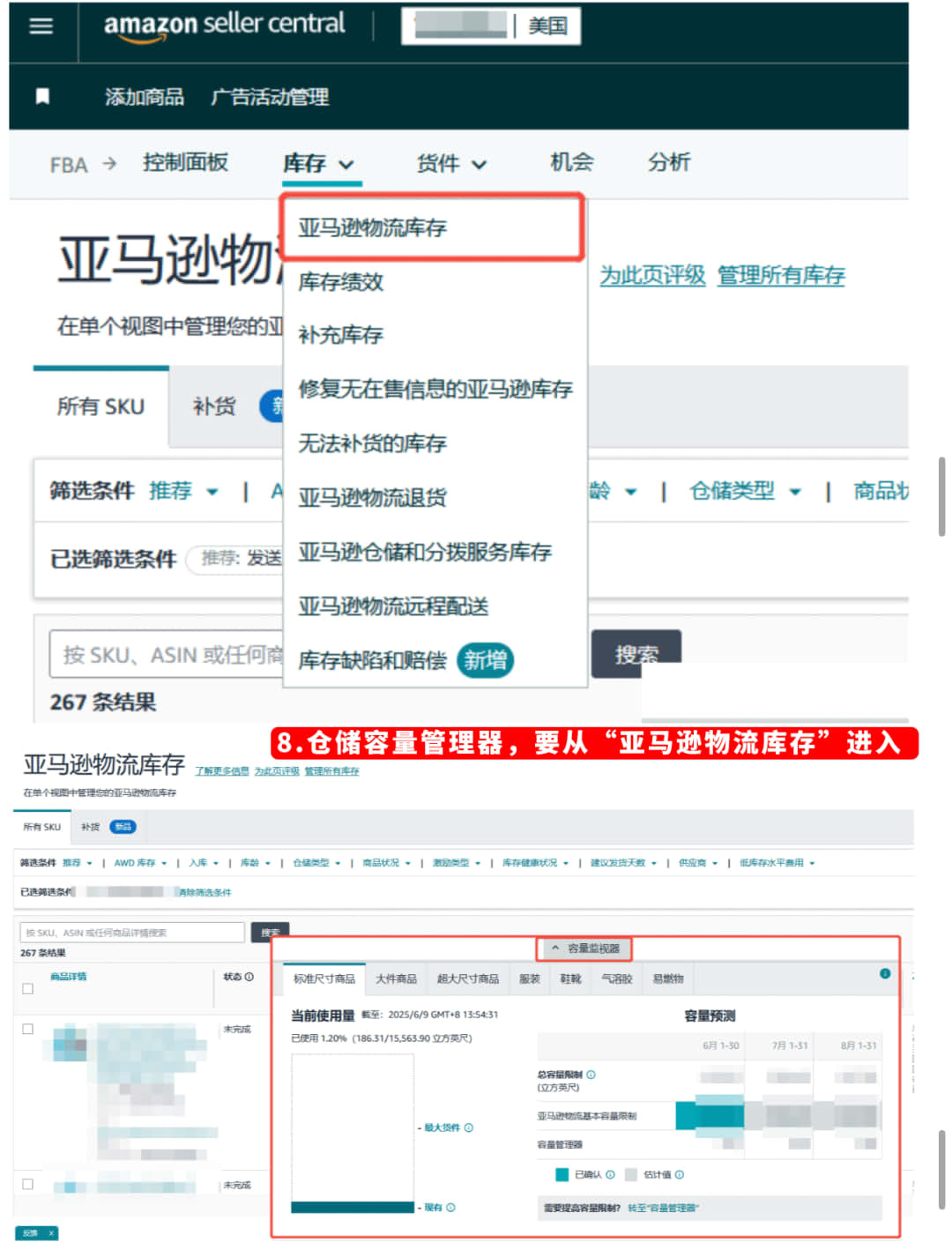 🔹卖家可以进入卖家后台,在亚马逊物流控制面板底部的“容量监视器”中查看容量限制和容量使用情况;