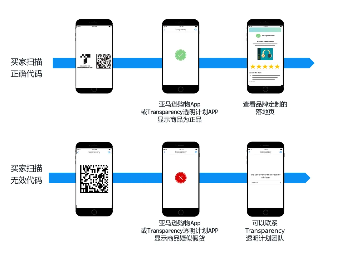 ● 亚马逊物流(FBA):亚马逊在商品入仓和出仓时都将检查商品外包装上是否正确应用了Transparency透明计划标签,只有正确应用的商品才能通过FBA仓库检查。