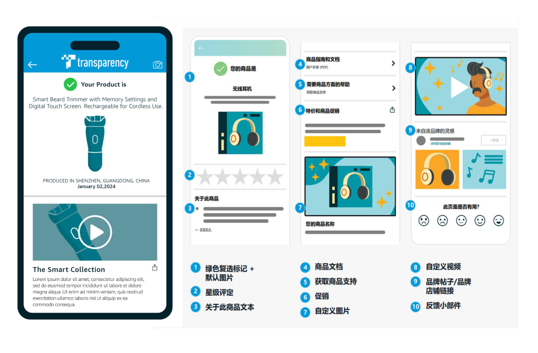 消费者使用亚马逊APP扫描Transparency透明计划代码后,将跳转至品牌自定义页面。这里是零广告费的流量自留地,您可以: