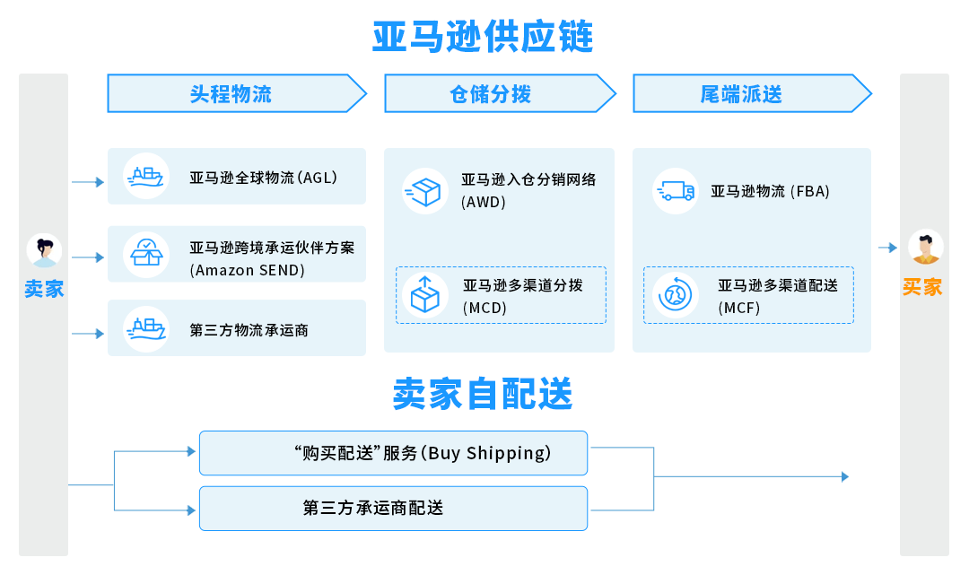亚马逊目前主要提供两种亚马逊配送(FBA)、卖家自配送(MFN)2种发货模式,新手卖家可以按需选择。